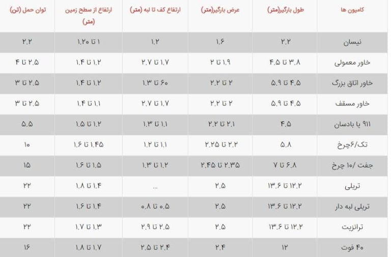 کامیون ها در انواع و اندازه های مختلف در ایران وجود دارند. یک کامیون معمولی 5.8 طول، 2.5 ارتفاع و 2.2عرض دارد. حداکثر باری که یک کامیون در کشور می تواند به صورت قانونی تحمل کند 20 تن است. در اینجا انواع مختلفی از کامیون ها وجود دارد که می توانید بر اساس اندازه جابجایی خود اجاره کنید.